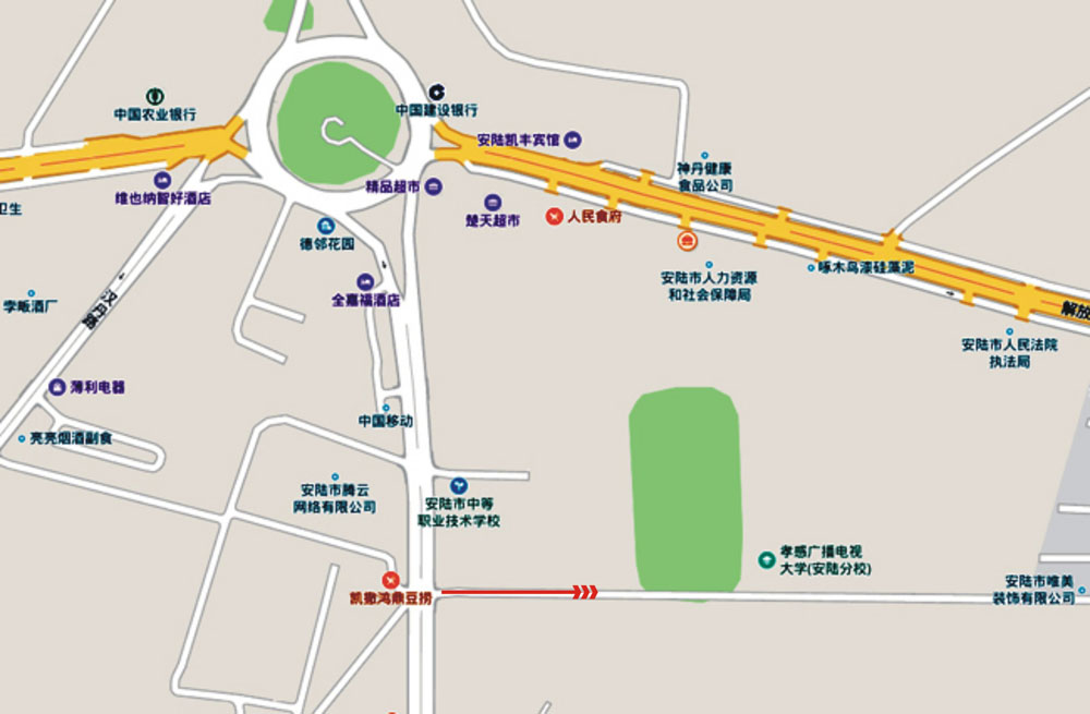 安陆广播电视大学由原职高(三中)迁至新址办公,在地图上面搜索时产生偏差。为方便考试人员快速、准确到达考点,请参考导航地图和下方地图确定线路。外地朋友请导航至“安陆凯撒鸿鼎豆捞”,凯撒门口有较大停车场,考点由马路正对面辅路进入。